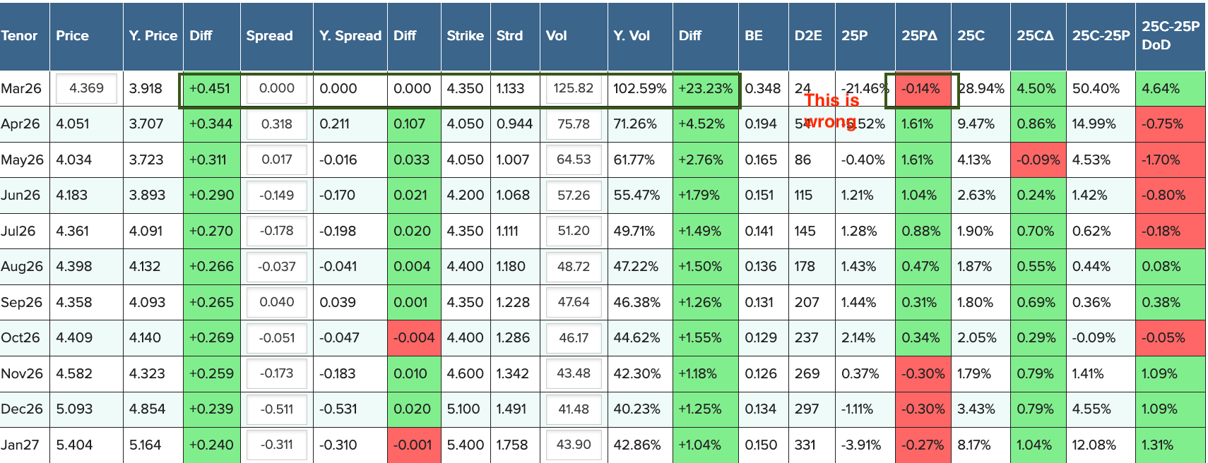 - March calls got bid (but not overtly so), most of the March up move was just in ATM. Relatively, I will call the call move weak. Still went higher, but JV call skew actually went down