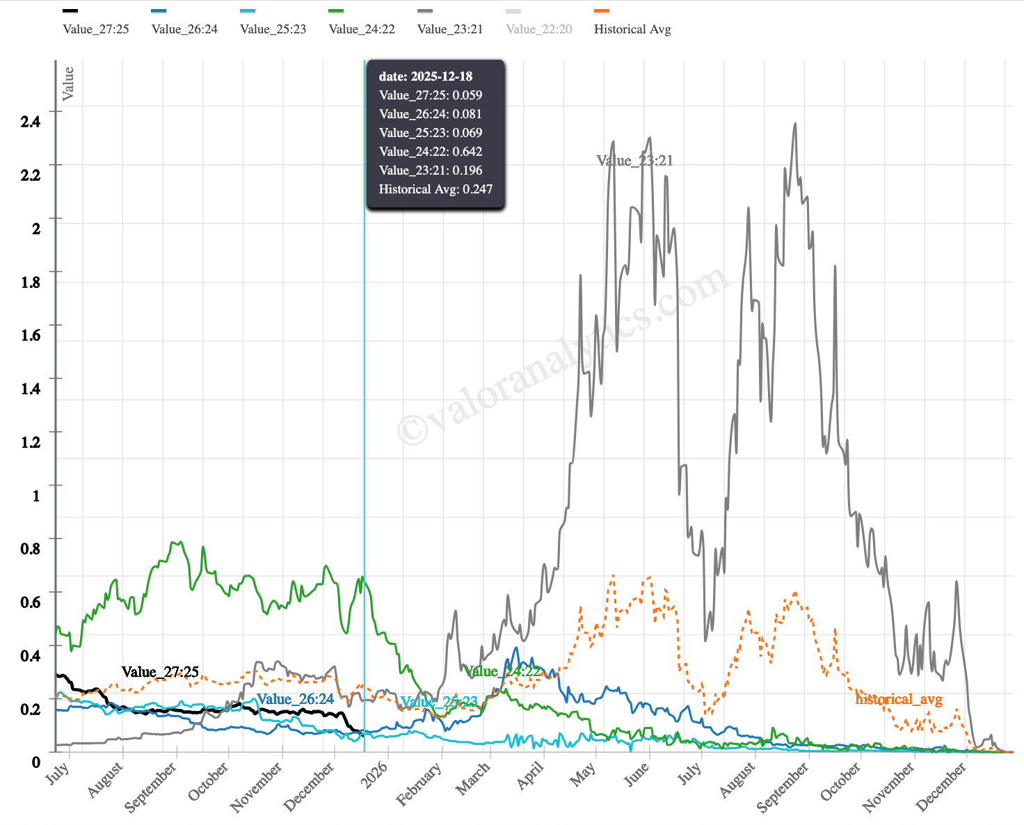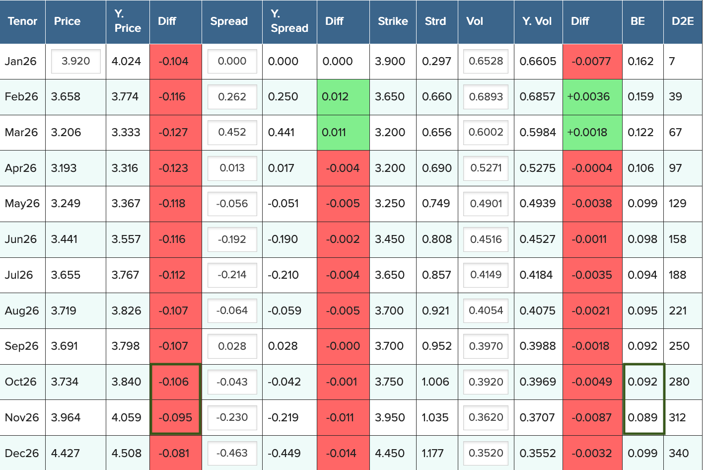 - Mar-Dec 3.50/3.25 put spread traded 11.2 cent. Idea is to just leave the Jan-Feb in case weather returns, but the downside beyond that is a certainty according to this market